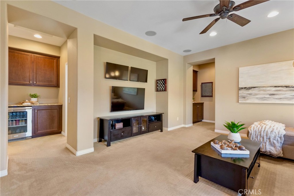 Built in 2011 by its original owners, the home features an open layout with three en-suite bedrooms, including a first-floor suite that provides privacy and convenience. Interior highlights include travertine and hardwood floors, crown molding, recessed lighting, dual ovens, California Closets, and a family room bar with surround sound extending throughout the main level and outdoor areas. A spacious loft with beverage center and three TV hookups creates an ideal space for movie nights or game-day gatherings.